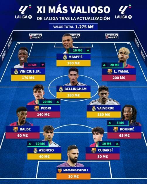 西甲最贵11人阵容:亚马尔姆巴佩领衔,玛玛达是非皇萨球员独苗